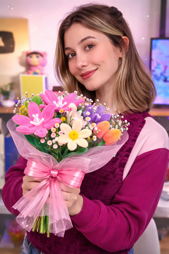 Sofía Sánchez comenzó a crear flores con limpia pipas a los 20 años, solo como un pasatiempo para distraerse en casa.Lo que parecía algo simple, pronto llamó la atención de otras personas… y sin darse cuenta, empezó a recibir pedidos.